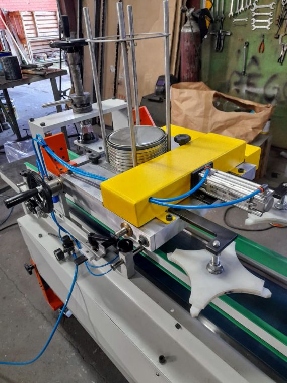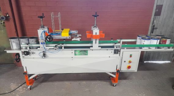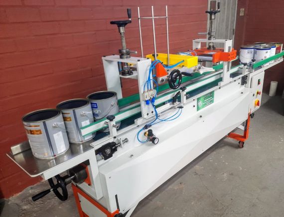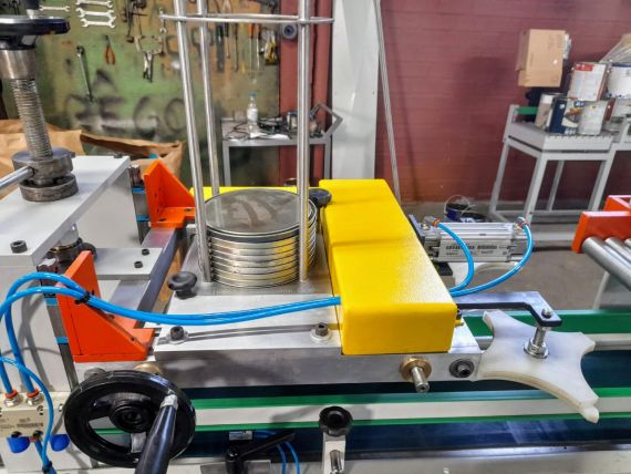 Fechador de baldes 3,6L e 1/4 com dispensador de tampas é capaz de fechar mais de 48 latas por minuto. O dispensador e o fechador com rolos de pressão tem regulagem de altura e dispensa latas do modelo PLUS e CONVENCIONAL. A altura da máquina também pode ser regulada conforme é o envase da fábrica.